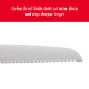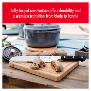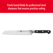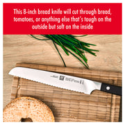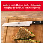 Elegante Kombination aus japanischer und deutscher Messerkunst, entworfen von den renommierten Designern Thun & Rodriguez. Das Brotmesser mit typischem Wellenschliff schneidet immer gut ab. Ganz egal, ob Brotkrusten, knackige Brötchen, getoastete Bagel oder aber einen gebackenen Braten. Für noch mehr Stabilität sorgt die keilförmige Form des Messers, das besonders robust in bewährter ZWILLING Qualität geschmiedet ist.