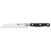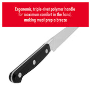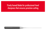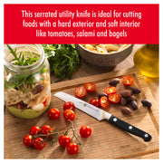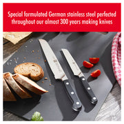 Spitzenklasse modern interpretiert: Diese geschmiedeten Premium-Messer im Nietendesign haben einen von Stardesignern Matteo Thun und Antonio Rodriguez schlank gestalteten Kropf (zwischen Griff und Klinge), der Ästhetik und Performance verbindet. Ambitionierte Köch*innen finden in diesem Messer ein passendes Werkzeug, um effizient und ermüdungsfrei zu schneiden. Der Wellenschliff macht das Universalmesser zu einem Allrounder in deiner Küche, der Wurst, Käse oder Tomaten in handliche Scheiben schneidet. Der fugenlos verarbeitete Griff aus Kunststoff liegt beim Arbeiten gut in der Hand. Durch die FRIODUR Klinge, die in einem speziellen Eishärteverfahren veredelt wurde, ist das Messer besonders scharf, langlebig und korrosionsbeständig. Qualität aus Deutschland – dafür steht dieses Messer mit all seiner Hochwertigkeit.