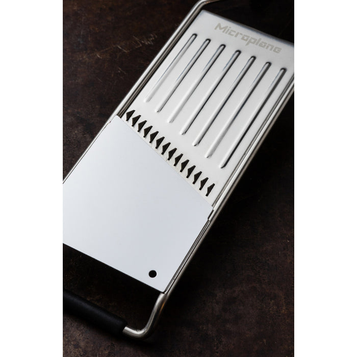 • Der Profi-Juliennehobel ergänzt die Reiben der Gourmet Serie von Microplane®, die mit 10 unterschiedlichen Klingen die Klingenkompetenz widerspiegelt
