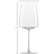 Dieses Glaskunstwerk präsentiert sich mit einer eleganten und dynamischen Optik. Die puristische Form des handgefertigten Weinglases ermöglicht ein intensives Entfalten der Duftaromen. Der breite Boden des Glases unterstützt die Entwicklung feiner Weinaromen, während der schmale Kamin sie sanft zur Nase führt. Ein intensives Erlebnis für alle Sinne.