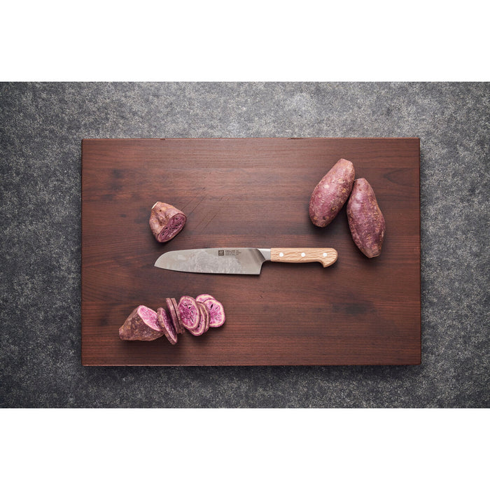 Pro Wood ist eine Sonderversion der Premium Pro-Serie: Aus einem Stück geschmiedete Messer mit einem hochwertigen Griff aus Steineichenholz. Es verleiht dem Drei-Nieten-Griff eine natürliche und besonders edle Optik, passend zu deiner individuellen Küchenwelt. Wenn du vielseitig und Allrounder*in in der Küche bist, hast du hier und jetzt dein neues Lieblingsmesser gefunden: Das Santokumesser der Serie Pro Wood passt sich ideal deinen Ansprüchen an, es ist ansprechend im Design und kann dir im Küchen-Alltag ein wertvoller Begleiter sein. Das Santoku wird in der japanischen Küche wegen seiner vielfältigen Einsatzmöglichkeiten geschätzt, da du es für Fleisch und Fisch ebenso gut einsetzen kannst wie für Gemüse. Dank der ergonomischen Form des Griffs aus Steineiche in der Farbe Natur liegt das Messer stets angenehm in der Hand. Die eisgehärtete FRIODUR Klinge aus rostfreiem Edelstahl bietet besonders hohe Schneidhaltigkeit und Haltbarkeit bei gleichzeitiger Flexibilität. Dieses Messer wurde in Deutschland gefertigt.